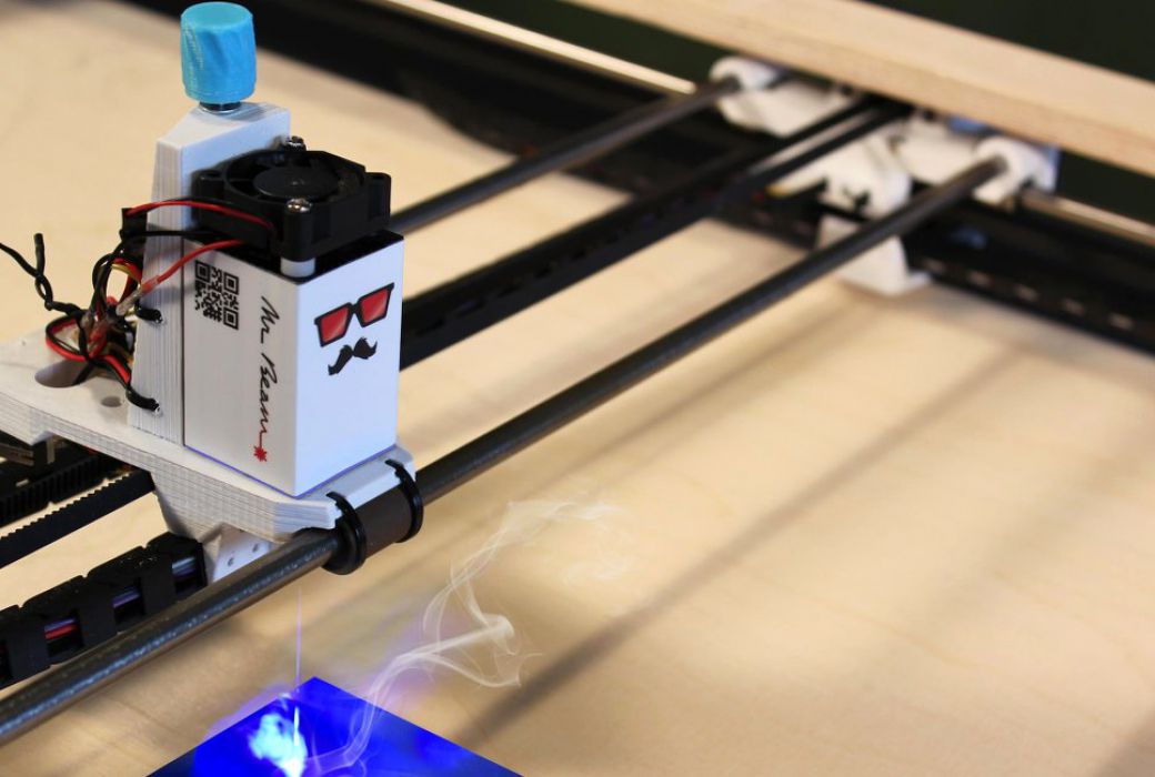 Mr Beam is a DIY laser cutter and engraver kit, inspired by other open source laser cutter projects, that offers a large working area while using an affordable laser diode. Instead of putting a workpiece inside the working area of the laser cutter, Mr Beam can be placed easily on top of large workpieces like a kitchen table or your wooden floor. The project was successfully crowdfunded on Kickstarter, where it raised more than $179.000, so almost 4 times more than the expected amount. All plans will be released under an open source license. The main goal of the project is to make laser cutters easy to use, affordable and enjoyable for everyone.