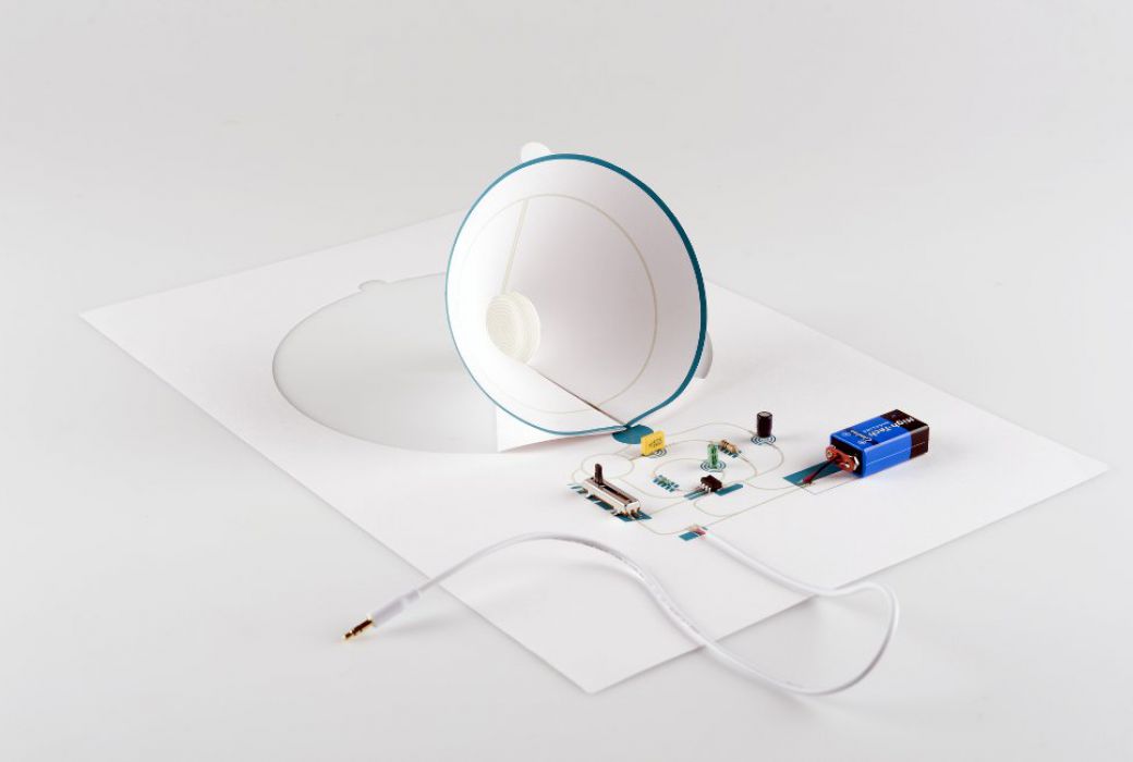 Coralie Gourguechon is a french designer. Her interest in electronic and digital devices started from a realisation that she wasn’t able to repair digital devices. Through physical and semantical dissections, she tried to understand and simplify those objects. This anatomical chart of a speaker presents the hidden operating system in a graphical way, it is an educationnal tool that should be intelligible and attractive. Here, the anatomical chart looks like a skinned speaker, with components left visible, and signs that visually represent their technical role. The speaker cone is detached from the sheet, and spreads out to form a mechanical amplification of the sound system. When flat, the speaker is turned off, as the folding close the circuit, creating a switch system mecanically.